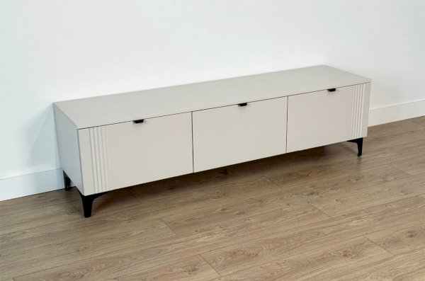 Тумба оснащена тремя распашными дверцами, которые открывают доступ к просторным внутренним полкам, идеально подходящим для хранения посуды, бытовой техники, аксессуаров или других предметов. Металлические ручки придают изделию современный вид и удобство в использовании.