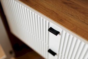- Между стационарными перегородками два ящика друг под другом на направляющих нижнего крепления не полного выдвижения с доводчиком.