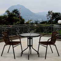Комплект с двумя стульями с ротангом коричневого цвета и круглым столом.