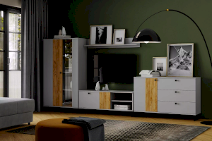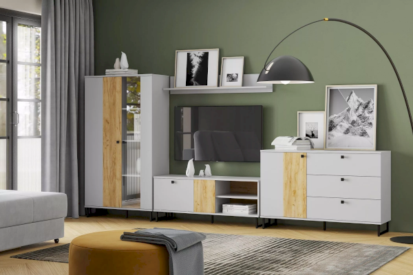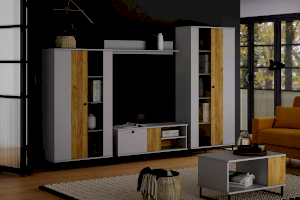 Коллекция БРУНО – это современный дизайн с характером, который отлично впишется в стиль лофт. Цвет платиново-серого и золотого дуба гармонично подчеркнут контрастными черными ручками и черными металлическими опорами.
