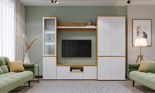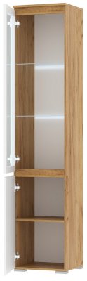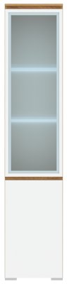 Применение интегрированной ручки на фасадах делает модель стильной и безопасной – дверцы открываются за профилированные выступы. Фасады обработаны кромкой 1 мм. Возможна установка светодиодной подсветки стеклополок (дополнительная опция). Черная регулируемая ножка-опора.